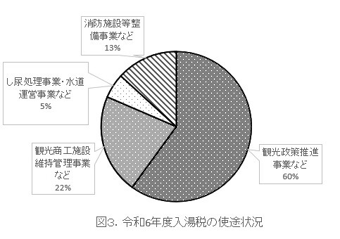 入湯税は、環境衛生施設、鉱泉源の保護管理施設及び消防施設、その他消防活動に必要な施設の整備並びに観光の振興に要する費用に充てられます。