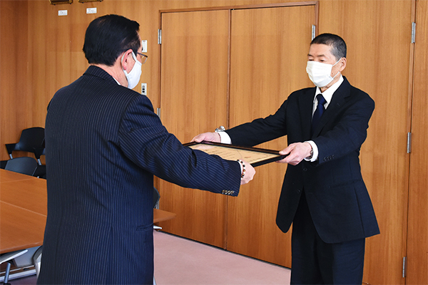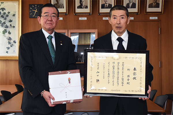 式では猿子町長から表彰状と記念品が伝達され、猿子町長は「長年にわたる活動に感謝します。今後も環境保護や災害防止に向けご尽力いただきたいです」と感謝と激励の言葉を述べ、
