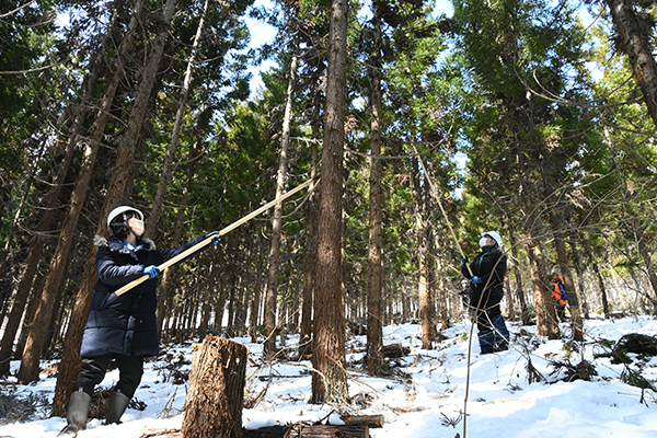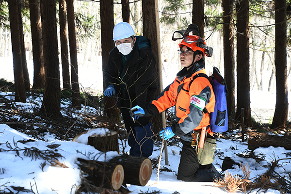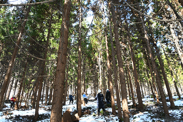 社員らは長さ2メートルほどの枝打ちのこぎりを手にし、雪が残る林の中へ。慎重かつ丁寧に枝打ち作業に取り組み、約2時間ほどで枝打ちされ見通しの良い林に生まれ変わりました。作業後には「思っていたよりも簡単に作業ができました。枝打ちをして見通しの良くなった林を見ると気持ちがいいですね」と話し、達成感をにじませていました。