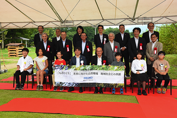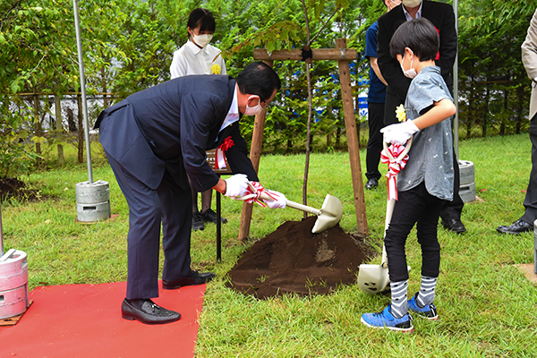 今回の式では、オオヤマザクラの記念植樹が行われ、町内の児童6人と完成を祝う場面も。猿子町長は「持続可能な地域環境の保全のため、本町事業者の模範として継続して活動に取り組んでいただきたい」と 期待を寄せました。
