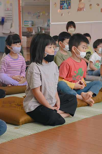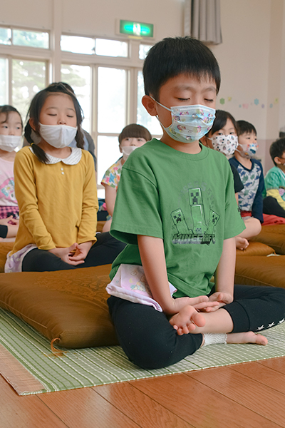 園児らは、慣れない足の組み方に苦戦しながらも背筋をまっすぐに姿勢を正し、5分間の瞑想に挑戦。誰一人話すことなく、静かに座禅に集中していました。