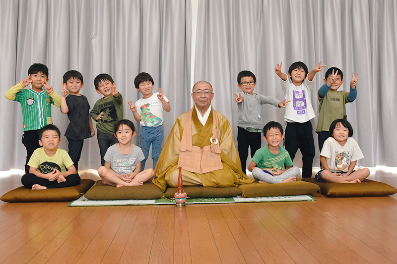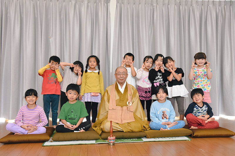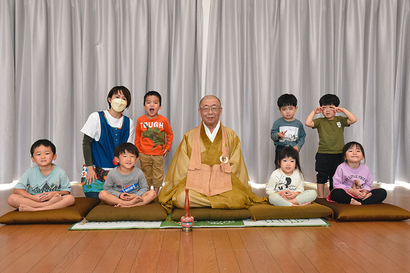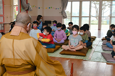 座禅の終わりには「おかげさまの心」を説く詩を紹介。「君たちが元気で過ごしているのも、お父さんやお母さん、保育園の先生や地域の人、周りのみんなのおかげです。感謝の心を持ちましょう」と園児らに語りかけていました。