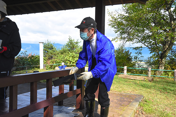 同会では毎年10月8日の「世界ライオンズデー」に合わせ毎年奉仕活動を実施しており、今年は剥がれなどの劣化の目立ってきた東屋のペンキ塗りを実施。