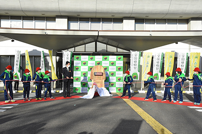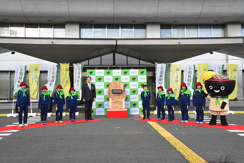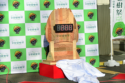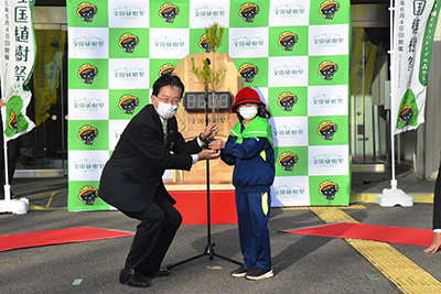 また、達増知事と児童によるカウントダウンボードの除幕も行われ、達増知事は「カウントダウンボードは県産の広葉樹6種の木をふんだんに使い、本県で開催する植樹祭にふさわしいものとなっています。植樹祭に向けて準備を加速し、県民みんなで一緒に大会を成功させましょう」と呼びかけました。