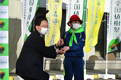 児童たちは、「たくましく大きく育ってほしい」と苗木のスクールステイで5ヶ月間育てたナンブアカマツとオオバクロモジの苗木10本ずつに願いを込め、達増知事に手渡しました。