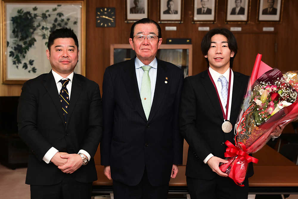 3月3日にカタール・ドーハで行われた、体操種目別ワールドカップのゆか競技において銀メダルを獲得した南一輝選手(エムズスポーツクラブ所属)が、3月10日(金)に猿子町長を表敬訪問しました。