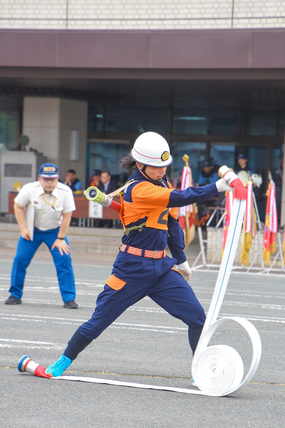 競技会には、ポンプ車の部に8隊、小型ポンプおよび規律訓練の部に各4隊が出場。消防操法競技に求められる操作の三原則「安全・確実・迅速」を追求し、なりわいの傍ら昼夜を問わず訓練を重ねて磨いた技量を発揮しました。