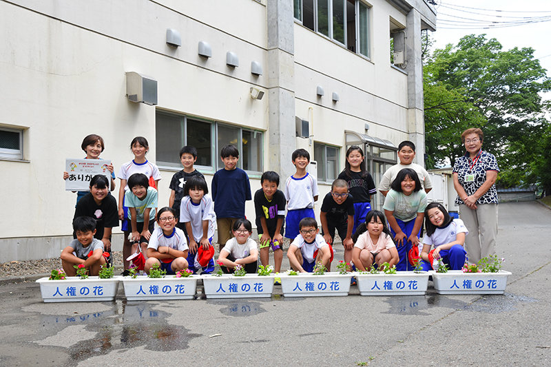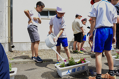 指導を受けた児童たちは、3人1組でプランターにベゴニア、ペチュニア、日々草の花苗を協力しながら定植。工藤四葉さんは「人権擁護委員さんのお話を聞いて、困っている友達がいたら助けたいと思った。綺麗な花なので、大事に育てたい」と話しました。
