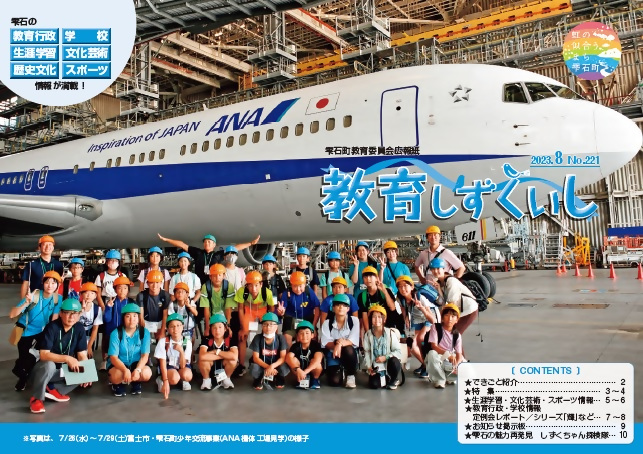 <表紙> ・富士市・雫石町少年交流事業 <P2>できごと紹介 ・イケてるおやじ&マダム学園 秋田岩手大人の運動会へ参加 ・町相撲協会が表敬訪問 ・しずくいし子育ち寺子屋in西山地区、七ツ森地区 <P3~P4>特集 ・富士市・雫石町少年交流事業 ・東京藝術大学合宿招聘事業 ふれあいコンサートin雫石 <P5~P6>生涯学習・文化芸術・スポーツ情報 ・今月の一冊・イベント情報 ・雫石町歴史民俗資料館から ・岩手県中学校総合体育大会結果 ・町内で行われる各種スポーツ大会予定 <P7>教育行政・学校情報など ・教育委員会定例会レポート ・アーチェリーって楽しい!第19ラウンド <P8>シリーズ「輝」 ・御所小学校の取り組み <P9>お知らせ掲示板 ・ちょっと森林浴散歩 ・ビジターセンター周辺生き物探検 ・夏休み自由研究展を開催 ・雫石町民相撲大会出場選手募集中 ・スポーツウエルネス吹矢体験教室 ・厨房レッスン ・未就学児検診 <裏表紙>しずくいしの魅力再発見 しずくちゃん探検隊 ・雫石町ジュニアリーダーズクラブSKY |