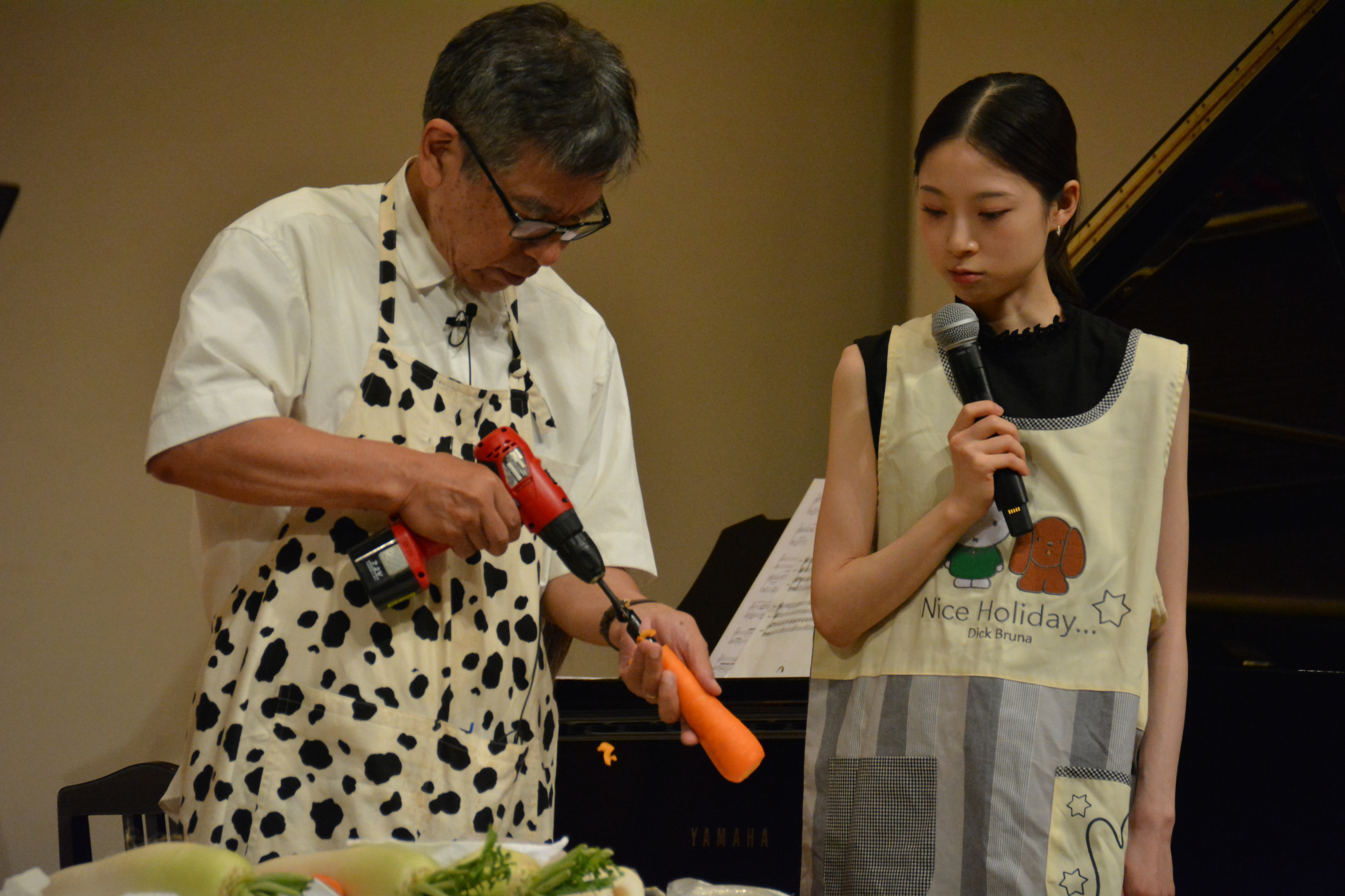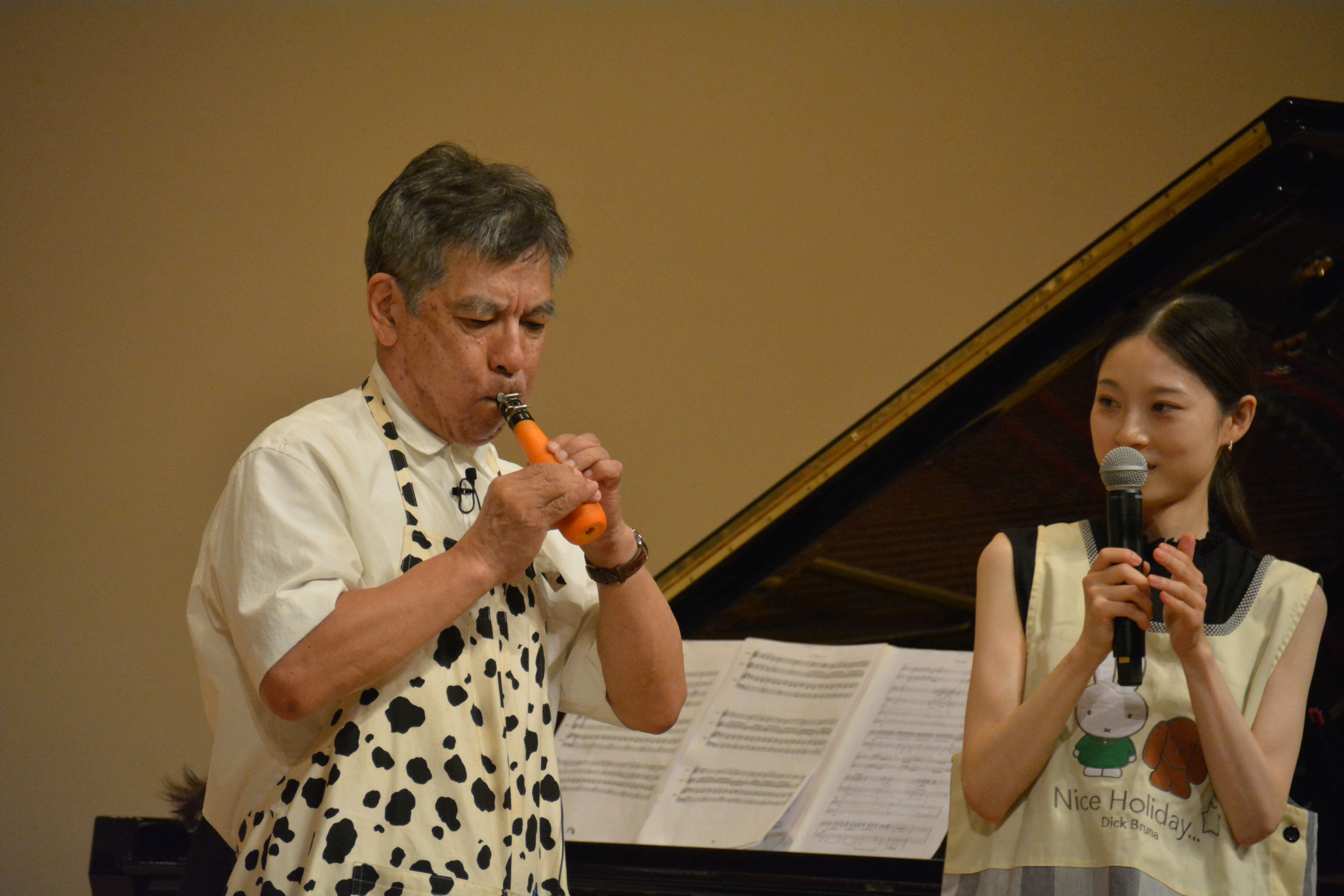 メインコンサートでは、恒例の野菜クラリネット(キャロリネット)を作るコーナーや演奏に合わせて、美空ひばりの名曲が歌われたり、大いに楽しめる内容でした。藝大器楽科有志の皆様の迫力ある演奏で、コンサートを盛り上げていただきました。