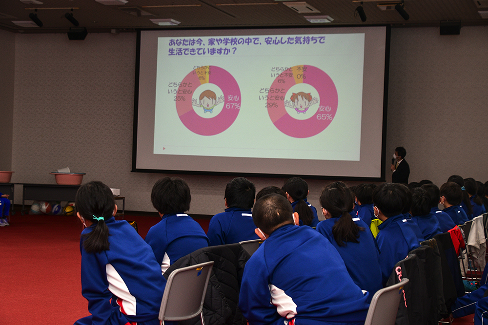 この講演会は、児童の「自他の生命尊重、自己肯定感の育成」や「困難やストレスに直面した時に信頼できる大人に助けの声をあげられる」ことを目標として、生きる力を育むために実施しています。