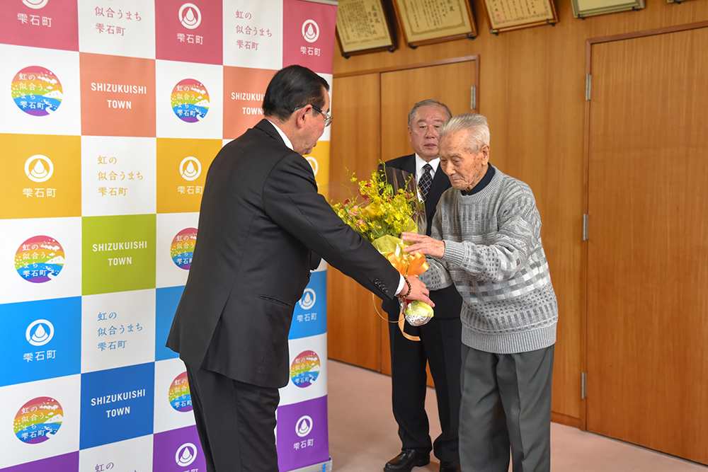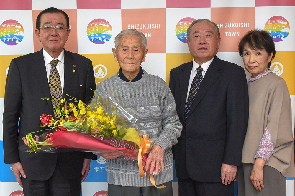 高橋榮吉さん(1924年1月3日生まれ)が、めでたく100歳の誕生日を迎えられ、1月9日、町役場町長室で百賀の祝いが開かれました。高橋さんにはご家族らが見守る中、猿子町長から祝い金と花束が贈られました。
