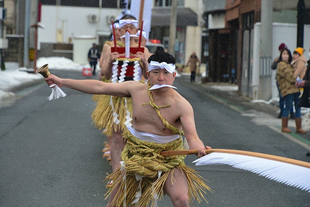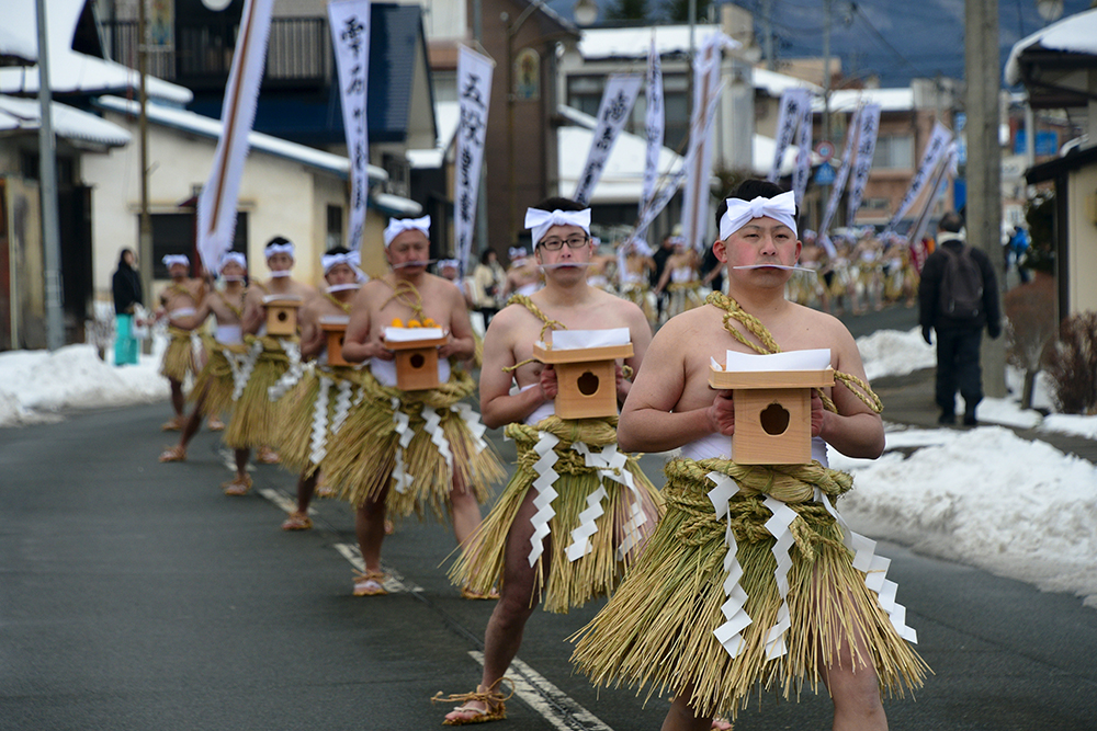 毎年厳寒の旧12月14日、古式にのっとった藁装束を身につけ、供物やのぼりを手に持ち、