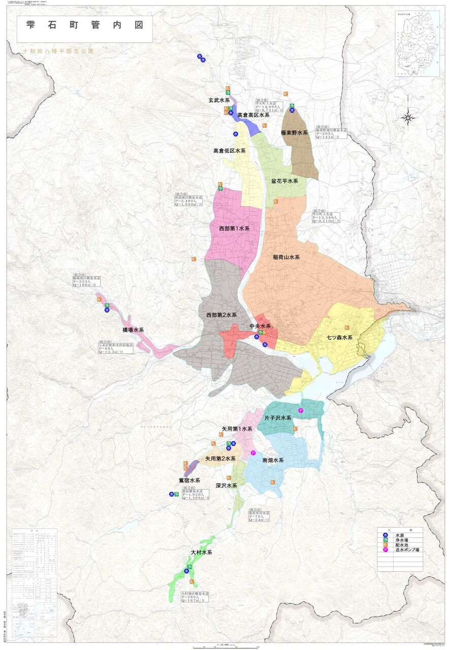 雫石町の給水区域図(上水道事業・簡易水道事業系統図、浄水場系統図、配水場系統図)は下記のとおりです。