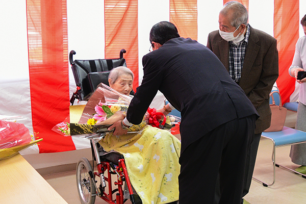 古舘ヒメさん(1924年5月5日生まれ)が、めでたく100歳の誕生日を迎えられ、5月10日、介護老人保健施設 はーとぽーと雫石で百賀の祝いが開かれました。古舘さんには、ご家族や職員らが見守る中、猿子町長から祝い金と花束が贈られました。