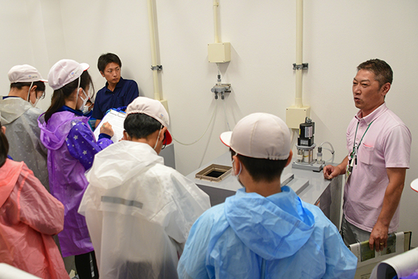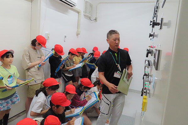 児童たちは、担当職員から町内水道全体の施設概要や、水が飲料水としてきれいになっていく仕組み・行程の説明を受けながら、管理棟や浄水棟、配水池ポンプ室などを見学し、メモをとりながら真剣に学びました。