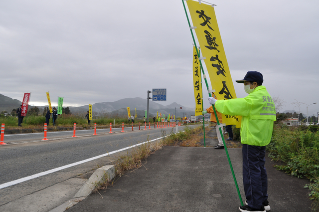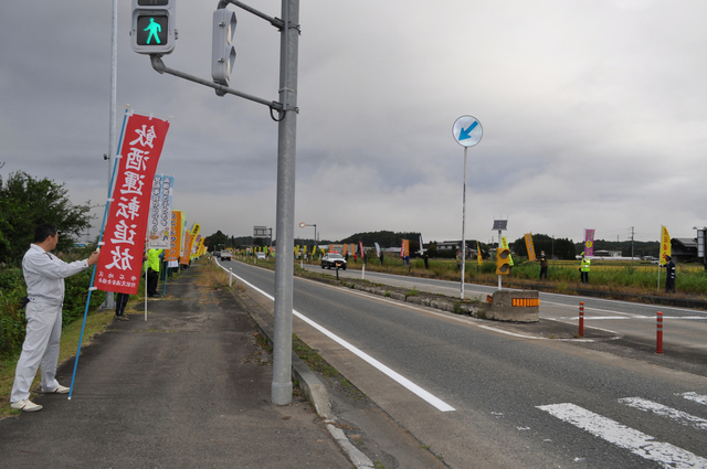 200人弱の参加者がのぼり旗を持って国道46号の沿道に立ち、ドライバーに交通安全を呼び掛けました。