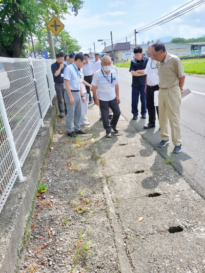 ▲令和6年8月7日実施 合同点検の様子(下春木場行政区・道路破損個所修繕要望ついて協議)