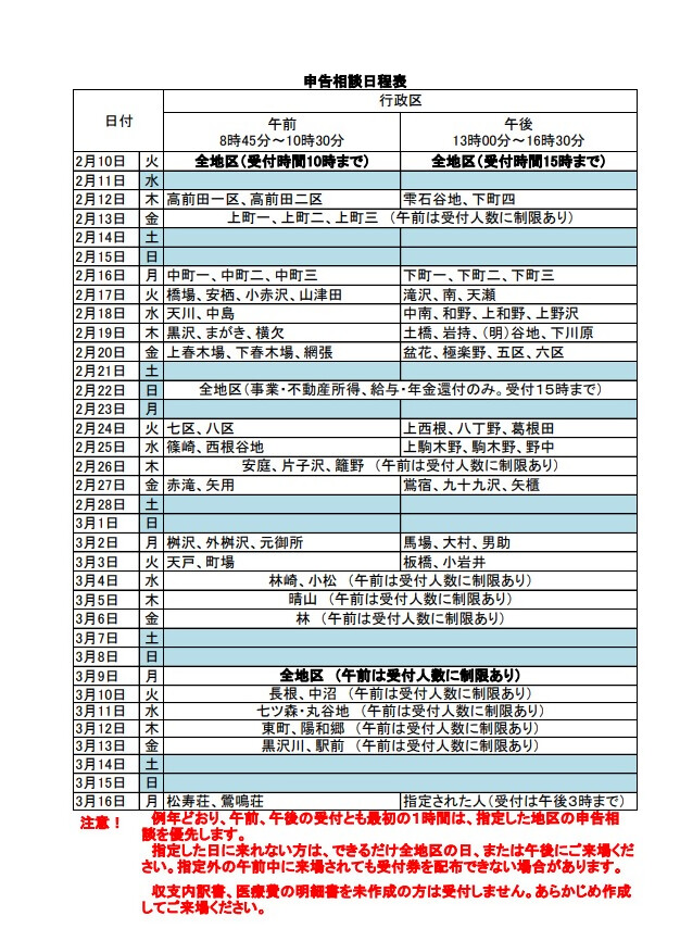 午前、午後とも最初の1時間は、指定した地区の申告相談を優先して受付します。