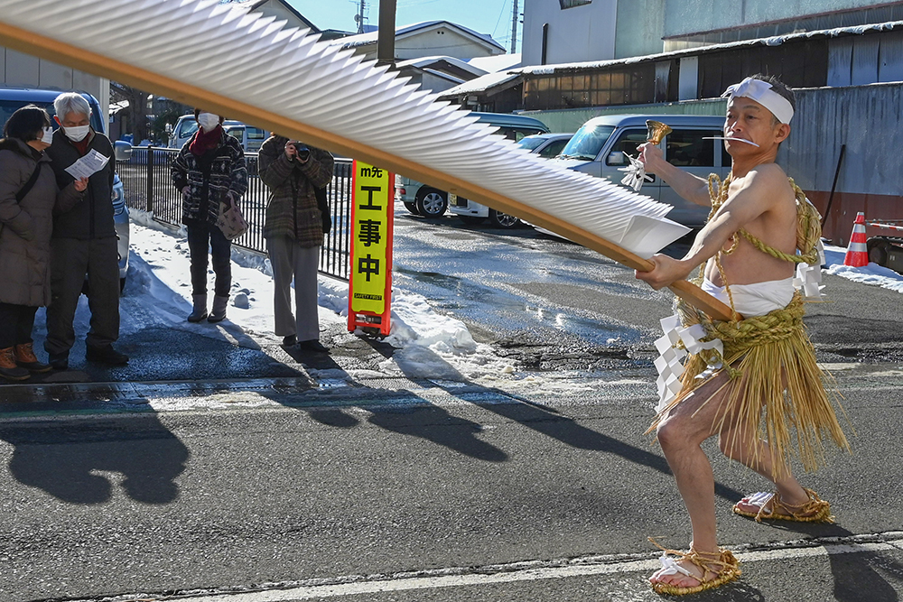 毎年厳寒の旧12月14日、古式にのっとった藁装束を身につけ、供物やのぼりを手に持ち、