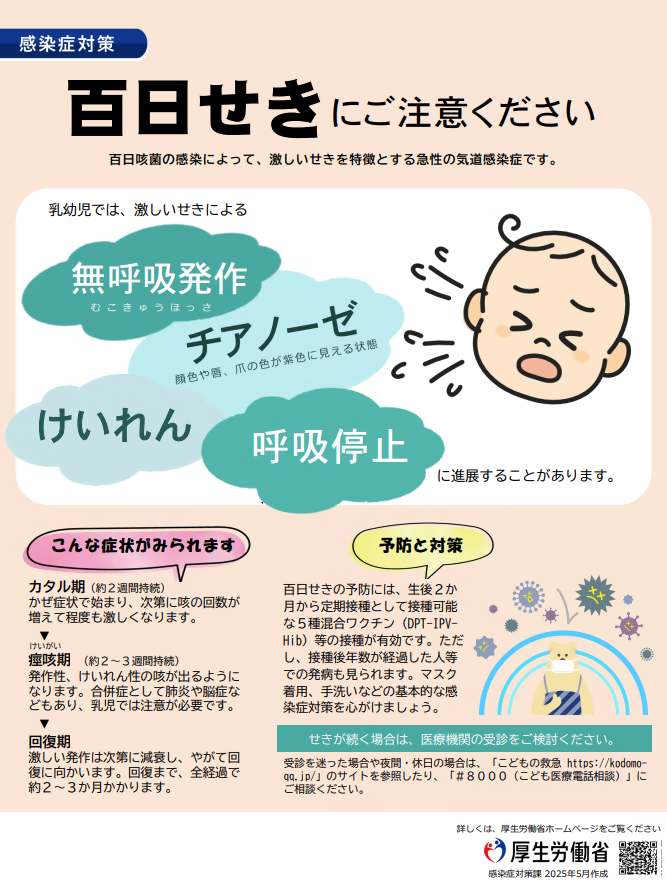特にワクチン未接種の乳幼児が百日咳にかかると重症化しやすい感染症です。