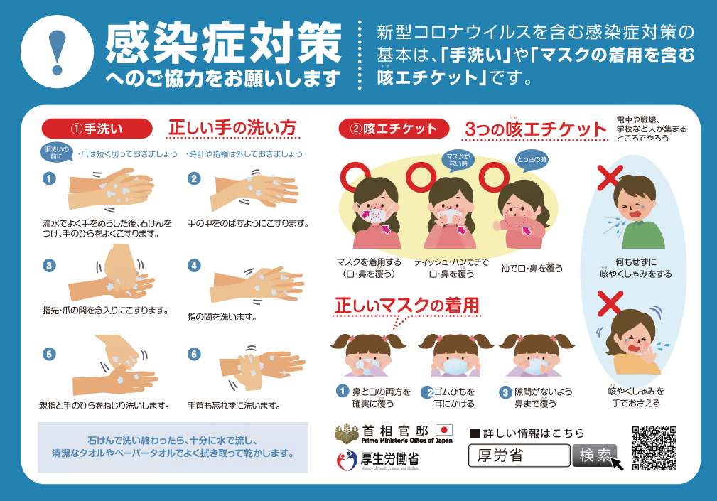 手洗いの励行、マスクを着用できる方は状況に応じてマスクを着用を心がけましょう。