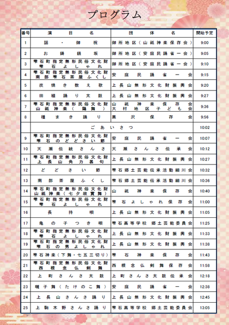 雫石町指定無形民俗文化財をはじめ、町内の民俗芸能保存団体が延べ25演目を行う予定です。