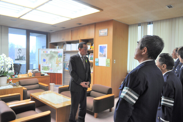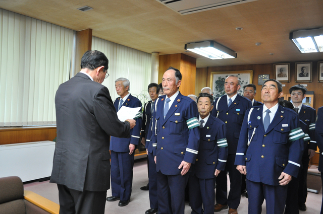 交付にあたり猿子町長は「交通死亡事故ゼロを継続しながら、本町の安全安心のためにご尽力を賜りたい」と訓示し、長澤嶺生隊長は「町民の安心安全のため、一層励んで参ります」と町の交通安全を守る誓いを新たにしました。
