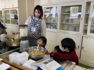 2月22日、雫石町で移住者交流会「大豆から作る豆腐作り体験」(転入者応援カフェ)が開催されました。場所は中央公民館の調理室。講師には、盛岡広域振興局農政部の早坂考広さんをお迎えし、移住者を含む大人14名、子ども2名が参加しました。