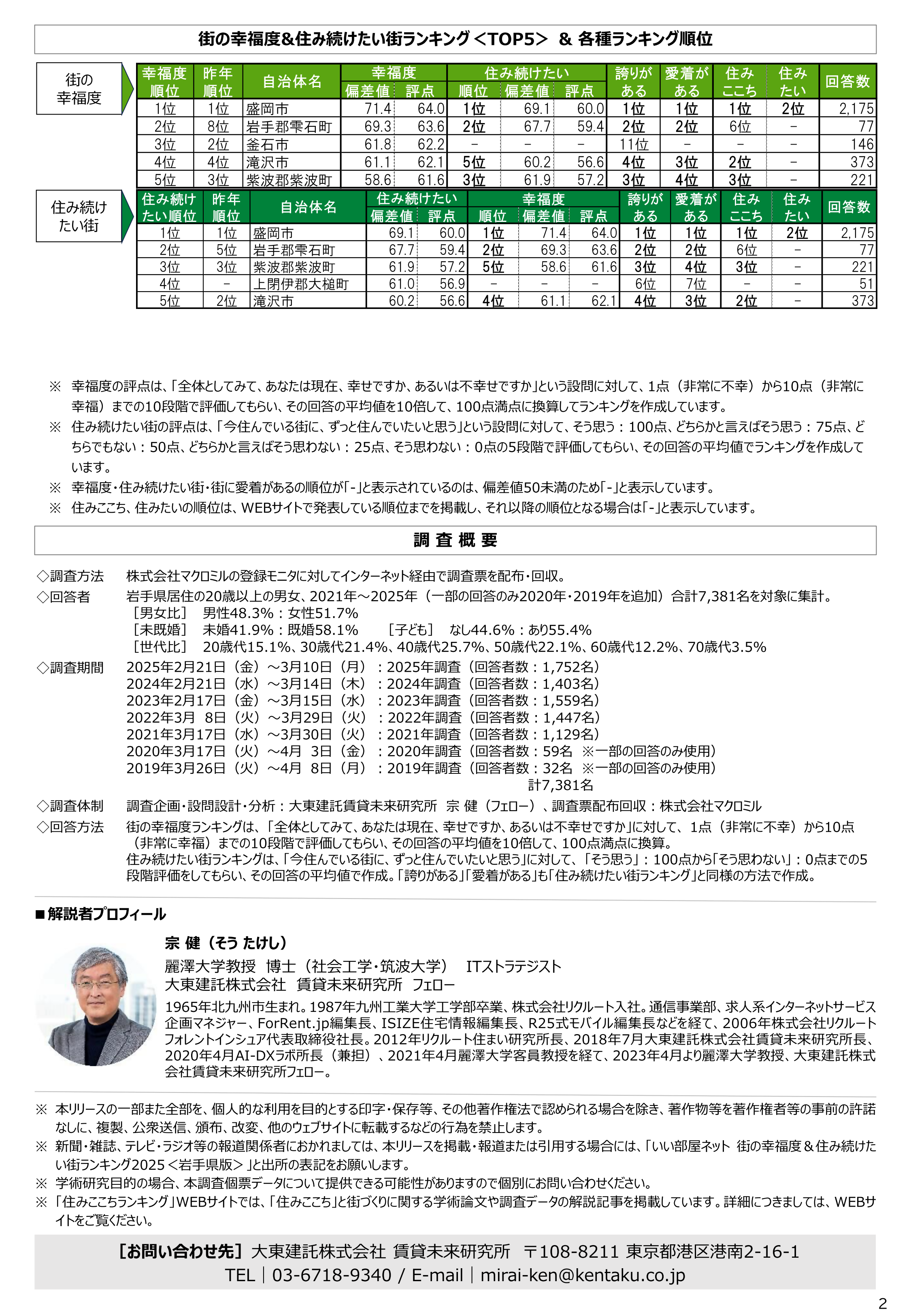 これは、実際に住んでいる人たちが「住み心地」や「住みやすさ」などをどう感じているかを調べたもの、 雫石町の魅力がしっかり評価されたってことですね。