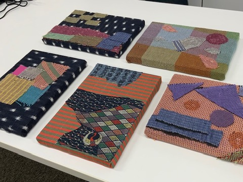 雫石町には、亀甲織をはじめとした伝統的な織物文化や、古くから大切に受け継がれてきた古布の文化があります。セミナーでは、そうした雫石ならではのモノづくり文化を体感していただくため、亀甲織や古布を使ったファブリックパネルづくりのワークショップを実施しました。材料は、町内在住リメイク作家の小赤澤直子さんからご寄付いただいたものです。